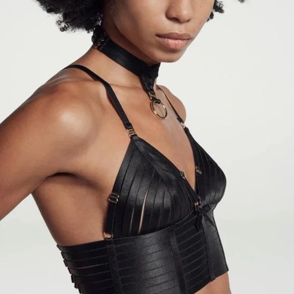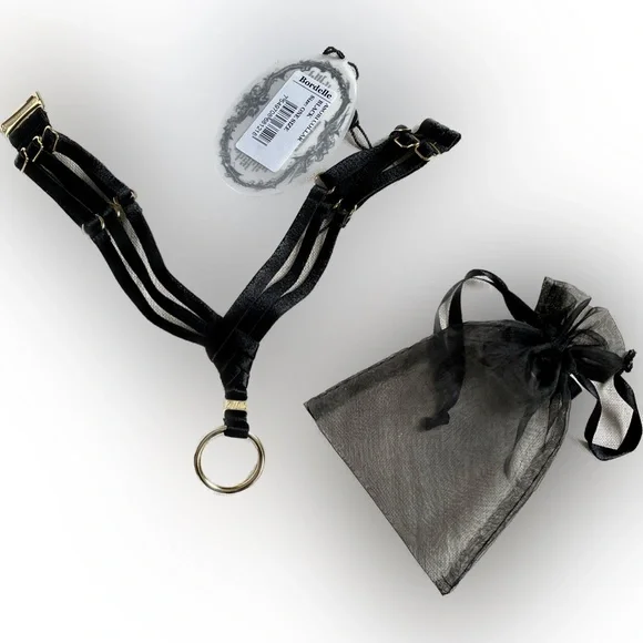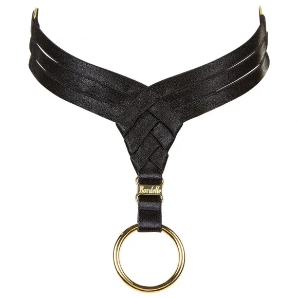 This coveted Bordelle accessory, characterised by the hand-woven satin elastic detail, 24k gold plated branded connector and distinct oversized ‘O’ ring is sold out in black and impossible to find.Details:Signature collar in classic BlackHand-woven satin elastic detailing24k gold plated componentsSwan hook fasteningFeatures adjustable back strapsIdeal gifting optionStyle with any Bordelle lookCare and Composition:Delicate handwash separately. Wipe gold components with a clean, dry cloth after each wash and wear. Elastic: 88% Polyamide, 12% Elastane.Style Number: SIGC01BMade in Romania Nowadays a collar or choker can´t be missed in your wardrobe. It is the trend to wear. Whether you wear a collar with your everyday wear or with your luxury lingerie, it adds a certain flair to your attire. The Bordelle Asobi Collar can be mixed and matched endlessly. It complements the entire Bordelle collection, whether it is the Bordelle Asobi collection, the classic collection, or the Kinbaku. The drop form and the golden ´O´ ring makes the Bordelle Asobi Collar a rare beauty. A beauty that deserves to dangle around your neck.