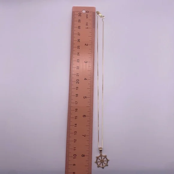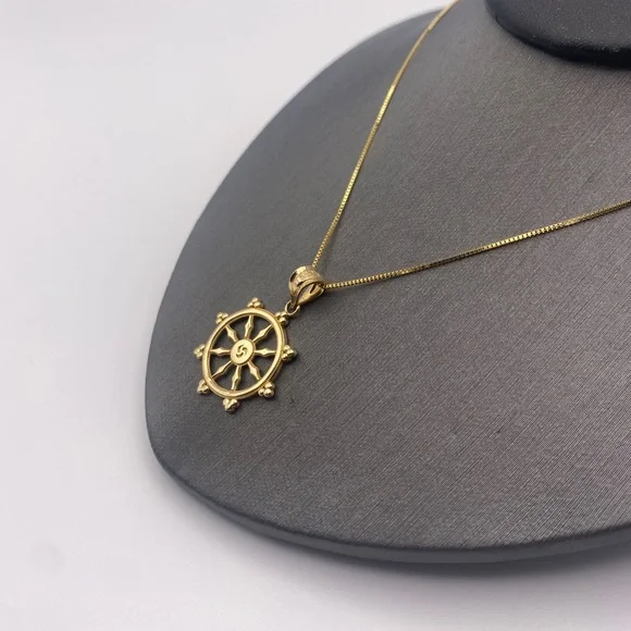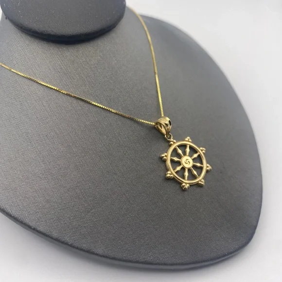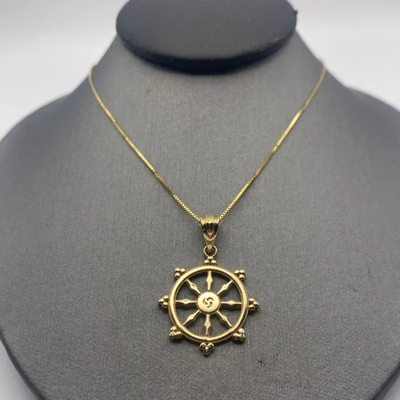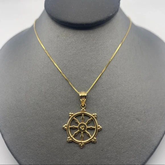 item #498 10k and 14k yellow gold Dharma Wheel necklaceChain is 16” 14k gold Pendant is 10k goldAll jewelry is tested for purity.Comes in a gift box and will be professionally cleaned before shipped