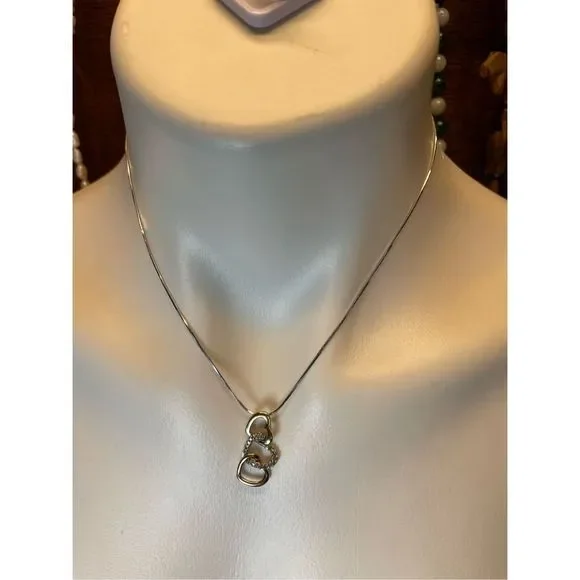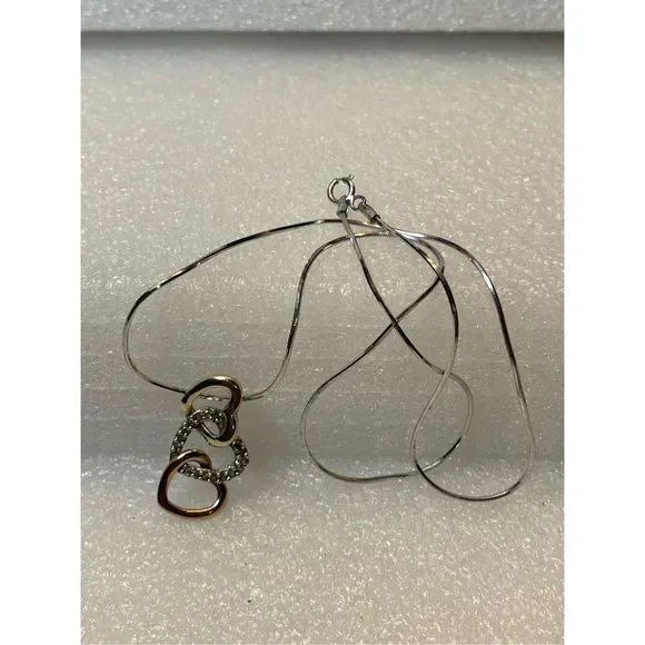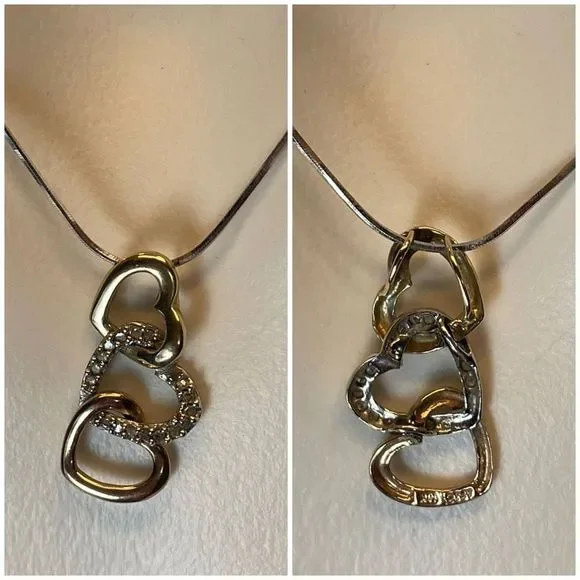 Here we have a beautiful 10KT tricolor (yellow, white and rose gold) triple open heart diamond pendant and 10KT white gold Italy snake chain necklace. Stamped 10K and tested real...