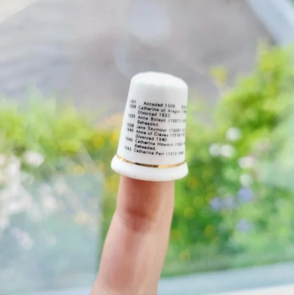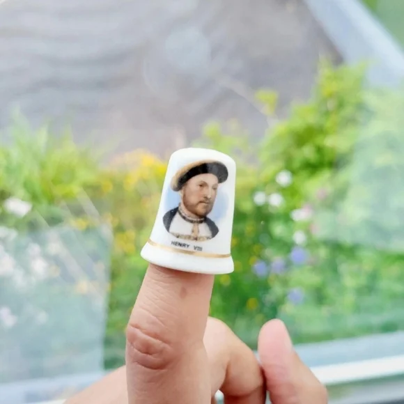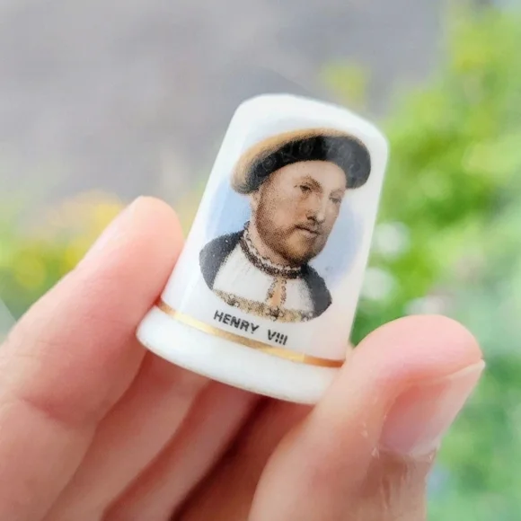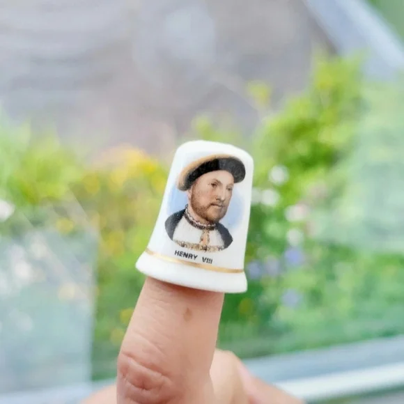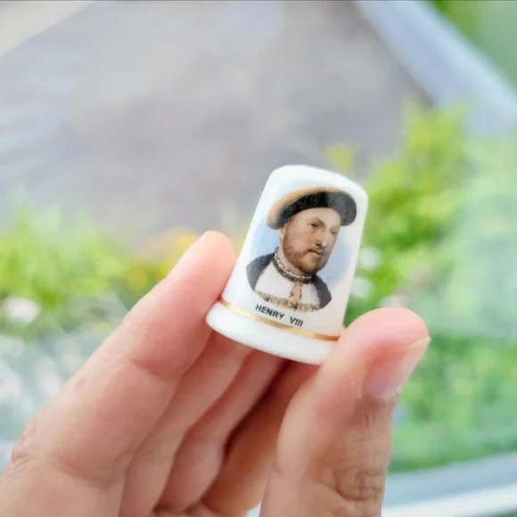 *RARE* Vintage Henry VIII the Eighth Collectible Fenton Fine Bone China Royal Family Thimble. Made in England..._____jewelry classic dainty elegant gift gifts present presents stocking stuffers chains estate metal vintage silver diy sewing kit equipment art supplies knitting craft crafts style royal family uk great britain peopthimH25