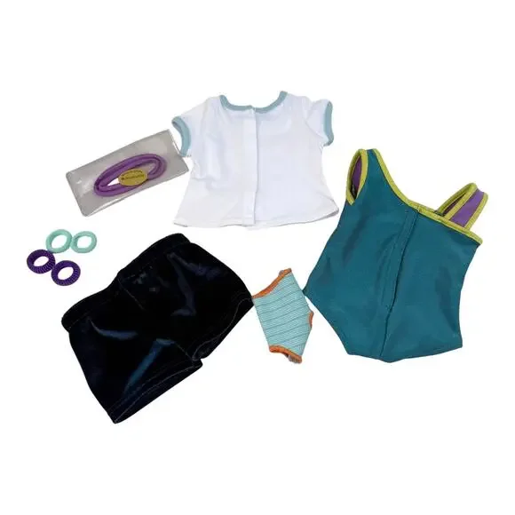 You Are Looking To Buy:American Girl 18" Doll Clothes MCKENNA´S PRACTICE WARDROBE Gymnastics Practice Set Outfit Shorts, Tee Shirt, Leotard, Headband, Hair Ties, Ankle Brace - NEW Condition!Details:McKenna´s Practice Wardrobe is part of McKenna´s Collection And, Like Her, Was Retired At The End Of 2012!This Set Is In NEW Condition And Comes With The Following Items:Leotard: Purple, yellow-green, and turquoise sleeveless leotard. It is similar to a one-shoulder design, but the second shoulder strap is present.Tee: Gymnastics tee with Shooting Star logo and a gymnastics graphic. Light blue trim and v-neckline. ´Gymnastics´ edged with small purple stars above and belowShorts: Dark blue velour shorts. Elastic waist and fold-over waistbandHeadband: Purple headbandHairbands: Two teal and two purple hairbands.Brace: Ankle BraceSize: Fits 18" Full Size American Girl Dolls (Dolls Sold Separately!NEW Condition!Great Gift for Him or Her - or For Yourself!Thank You!We will ship your order immediately upon receipt of payment. For your convenience, we do combine shipping and often discounts on multiple item orders to same address.Please Come Back To Shop And Buy Again!