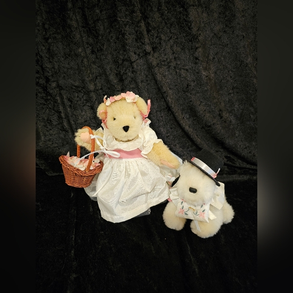 Muffy Vanderbear from the "Belles are Ringing" collection. Muffy´s Outfit:Muffy is dressed as a flower girl, wearing a white taffeta dress with a pink velvet sash, a tulle underskirt, and a flower garland on her head. She carries a wicker basket filled with flower petals. Collection Theme:The "Belles are Ringing" collection from the North American Bear Company focuses on a wedding theme, featuring Muffy as a flower girl and Lulu as the ring bearer. NOTE - Muffy is NWOT and Lulu still has her tags.
