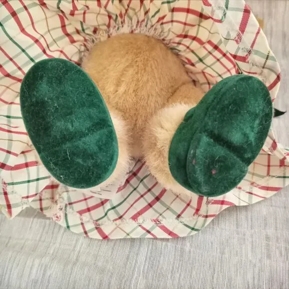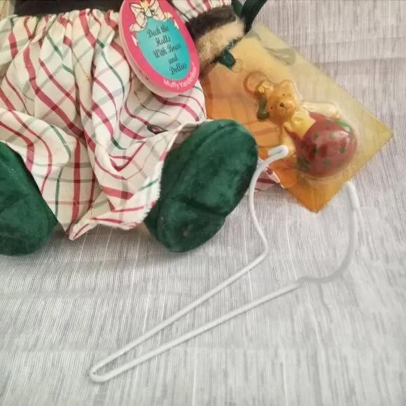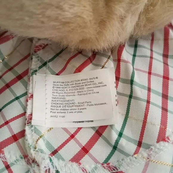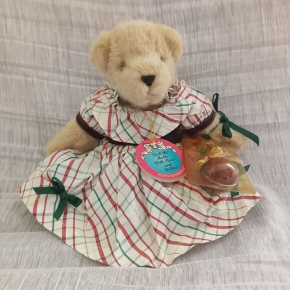 Vintage Muffy Vanderbear Stuffed Plush Bear, Deck the Halls with Bows and Dollies Collection, 1999. North American Bear Co Inc. RARE FIND! Adorable collectible bear has a crisp taffeta holiday dress in red, green, white gold metallic plaid, embellished with working buttons, puffy sleeves, neck ruffle, and green velvet ribbon. Her legs are jointed, and she has the cutest green velvet mary jane shoes, original tag, the original ornament still sealed, and a stand / hanger. Very Good Vintage Condition. Ornament packaging is sealed but has yellowed over time. Dress has a couple of very faint discolored areas, some laundry TLC may remove them. Smoke Free Home.Item#35660 Bin 15