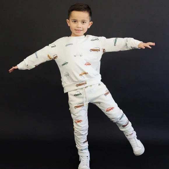 CC car and truck set Color: beige-cream white*Drawstring doesn’t actually work- there for style Stretchy and soft!CHILDHOODS - CC car and truck long sleeve and jogger set - boy VGUC***first 6 photos are stock!***Original price listed includes shipping and tax! Each piece (top & bottom/joggers) are $45-48 originally Says 4/5T but fits SMALLLLLLLL!! Best fits a 2/3TMinor wear on right knee, did my best to get stains out!....Brands for exposure:*Nora Lee, Rylee + Cru, Nordstrom, , Splendid, Boden Baby, GAP, 7 for all mankind, ZARA, Crewcuts, Tucker and Tate, Vans, Mini Boden, Vans, Mini Boden, Lucky Brand, Trary, Miniolie, Janie and Jack, Smallable, Pèpè, Mini Melissa, Childrenchic, Maisonette, , Mini Rodini, Nordstrom, Splendid, Janie and Jack, GAP, Pottery Barn Kids, Freshly Picked, Pink Olive, Crewcuts, Sovereign Code, Free Planet, Rags, Kate Quinn, Jamie , Art Class, Hurley, Vans, Mini Boden, Rachel Zoe, Billabong, E.G.G., Jamie , Art Class, Mini Boden, Rachel Zoe, Billabong, E.G.G. NY, Open Edit, Grayson Mini, A&F, Lucky Brand Jeans, Hanna Anderssson, Andy and Evan, Fin and Vince, Childhoods, The Tot, Brave Little Ones, Luna + Luca, Vineyard Vines, Ralph Lauren, Polo, Sol Angeles, Sara Sara, Joe’s, Vintage Havana, Tractr, Vintage Havana, aviator nation, little bird, Kapital k, jolly & goode, Appaman, CHASER, mini dreamers, Lola and the boys