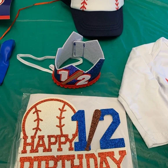All you need for a half birthday party. Two onesies, baseball hat, flags, and party accessories. Half way to First