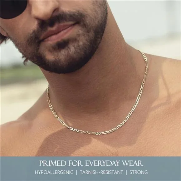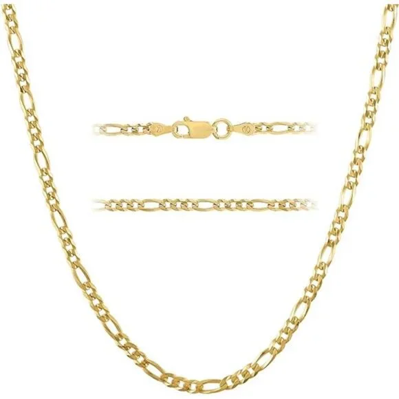 *Item width: 3 millimeters*Material: Sterling Silver*Metal Type: Sterling Silver*Clasp type: Lobster*Chain type: Figaro*Elevate your style - Add our 18k Gold plated Figaro necklace to your wardrobe. The flat diamond-cut links create a rich shine, offering a modern edge to any outfit. Slim and durable at 3mm, it´s perfect for daily wear. Whether worn solo for a polished look or stacked for a cool fashion statement, this versatile necklace suits any age and occasion.*Real 925 Sterling Silver Luxury - Crafted from 92.5% pure sterling silver, our figaro link chain is nickel-free and hypoallergenic - ideal for sensitive skin. Gold plated with a thick layer of 1 micron 18K yellow gold for added durability. Choose from various lengths, featuring a 1/8” wide (3mm) design with a secure lobster-claw clasp and spring mechanism.*Made in Italy Craftsmanship - Our Italian jewelry is not just fashionable; it´s a cultural masterpiece. Rooted in a rich history of creativity and passion, each piece reflects superior design excellence and quality craftsmanship. Invest in the finest Italian jewelry that meets the highest government quality standards.*The Perfect Gift - This timeless essential is the perfect gift idea for anyone—husband, wife, son, daughter, mom, dad, brother, sister, boyfriend, girlfriend, or best friend. Explore our store for a diverse selection of 18K gold-plated and sterling silver jewelry, including bracelets, necklaces, earrings, and anklets.