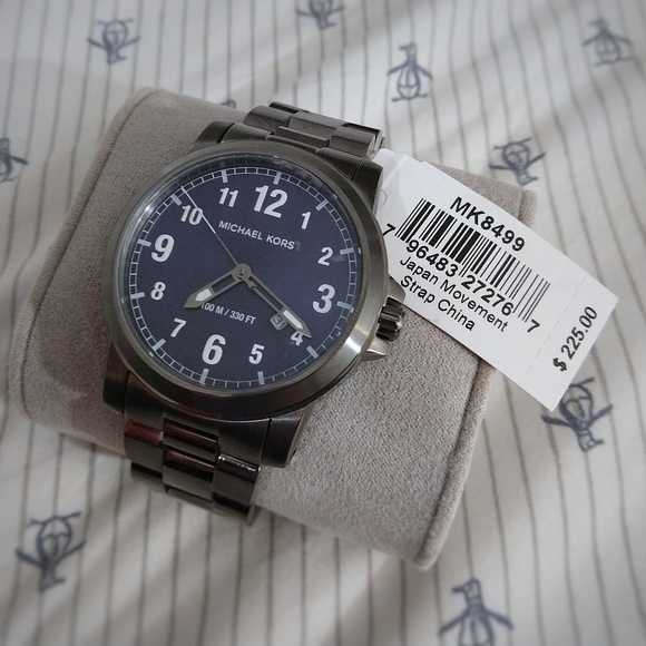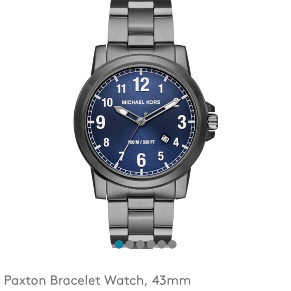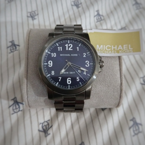 Still brand new, never worn Michael Kors MK men´s watch. New with tags (not attached tag but it´s there so NWT). Bought this and can´t get it to fit well so selling it still new (some links taken out but included). Case Material: Stainless steel Dial Color: Navy blue Movement: Quartz Crystal: Mineral Bracelet Material: Stainless steel Closure Type: Deployant Case Size: 43mm Case Thickness: 10mm Bracelet Width: 22mm Water Resistance: 100 meters