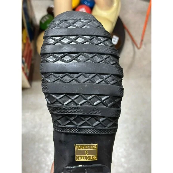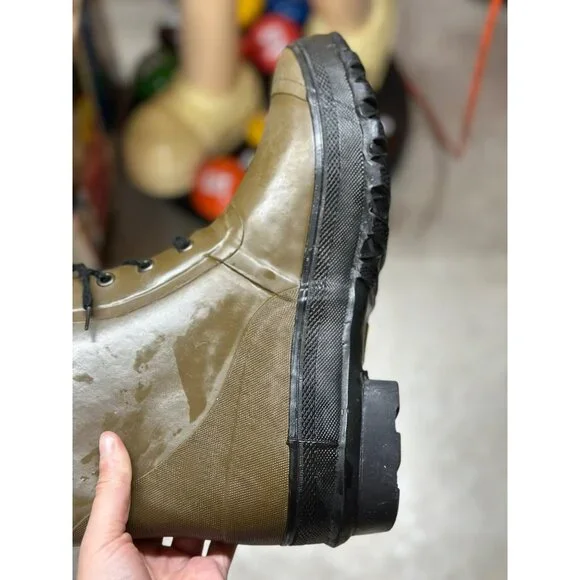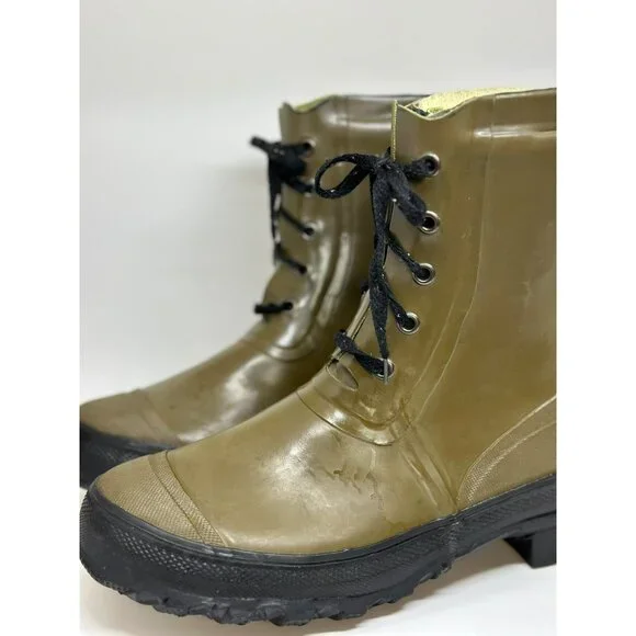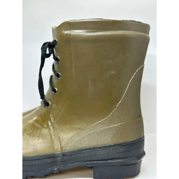 These vintage-style olive green rubber boots feature a sturdy lace-up design, fleece-lined interior for warmth, and a durable steel shank for support.• Insulated fleece lining for added warmth• Textured rubber sole with excellent grip• Steel shank for enhanced stability and durability• Classic lace-up closure design• Made in ChinaMinor scuffs and wear present on the outer rubber. In fair condition. Some staining on inside. No soles in shoes. Writing on tongue. vintage rubber boots,olive green boots,lace-up rain boots,steel shank boots,sturdy work boots,retro style boots,vintage rain shoes,men´s rubber boots,insulated winter boots,fleece-lined footwear,durable outdoor boots,waterproof vintage boots,classic utility bootsThanks for looking at mypage! I love to sell cool unique vintage, boho, & mid century modern pieces! Also selling name brand used clothing & new items (in all sizes)! If you have any questions please feel free to message me! I also love sending offers so make sure you like this listing if you would love to own it! I always ship fast & pack items with care! Over 2,000 5 star reviews on other platforms! Happy Shopping!New to ? Use code "OHCARLAYYY" for $10 off!List Perfectly 30% : "Ohcarlayy"