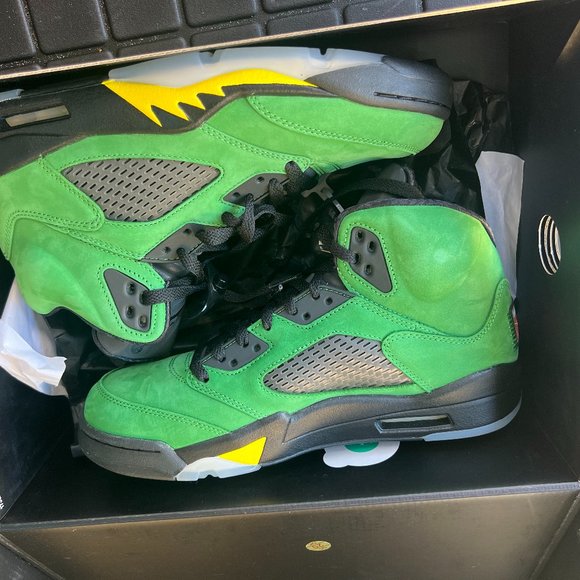 NEVER BEEN WORN! GREEN, BLACK, YELLOW AJ AIR JORDAN 5 RETRO SE OREGON SIZE 9. GREEN SUEDE. My son got them for a present and doesn´t like them.