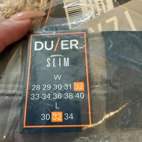 Color is "Civilian", stock photos are for pant style reference only, color is slightly different from the pair for sale.FeaturesSignature Gusset: Duer´s signature hidden gusset (performance feature) is integrated for extended range of motion and true flexibility.Power Stretch: Duer fabrics stretch in all directions, for maximum comfort, flexibility and maneuverability.Reinforced Seams: To create strength and longevity, Duer pants feature triple stitched inseams, gussets and back rises, as well as double layered back pockets.Temperature Regulating: The integration of COOLMAX fibers wicks moisture from the body in heat, and insulates for warmth in the cold, for incredibly versatile denim.SpecificationsFit: SlimMaterial: 62% Cotton, 30% TENCEL™ Lyocell, 6% LYCRA® T400® Polyester, 2% LYCRA® SpandexWe ship orders on Mondays, Wednesdays, and Fridays.All measurements are approximate.Colors may not be exactly reflected in photos, but we do our best.Check photos carefully.We make every attempt to point out any flaws in the description.Bundle to save!All products come from a smoke-free home.If you have any questions please send us a message.Any issues upon receipt of your order, reach out to me first and I´m happy to try and resolve!Thank you for your business.P54