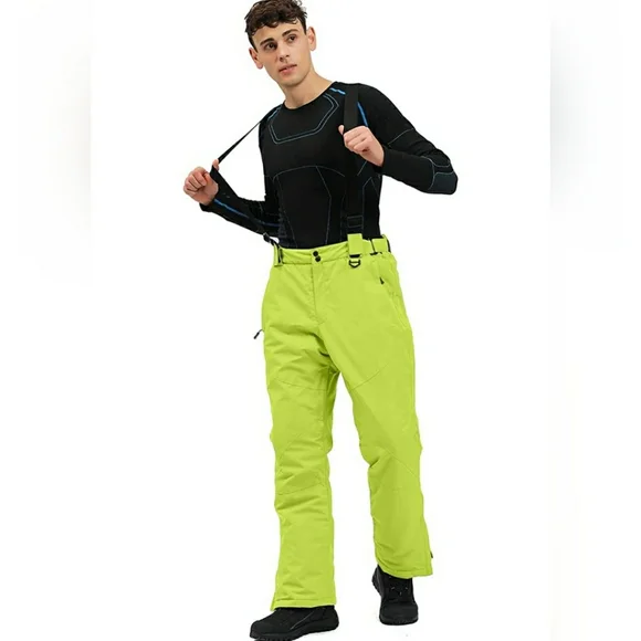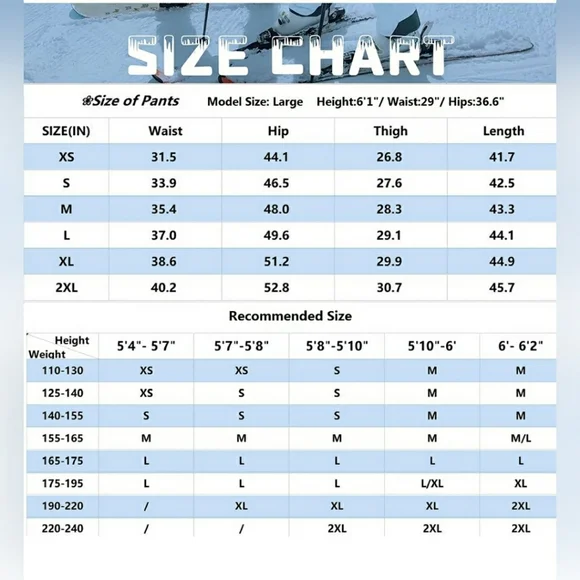 SKI PANTS SIZE: Please refer to the size chart in the picture or product description before ordering, or contact our customer service to select the right size.MATERIAL: The men´s snowboard pants are made of waterproof and durable fabric, breathable lining, filled with high quality silk cotton. Makes you feel flexible and comfortable while skiing&snowboarding.SNOW PANTS: Detachable and adjustable elastic straps, adjustable waist, breathable mesh with zip closure on the inner thigh, Inner elas