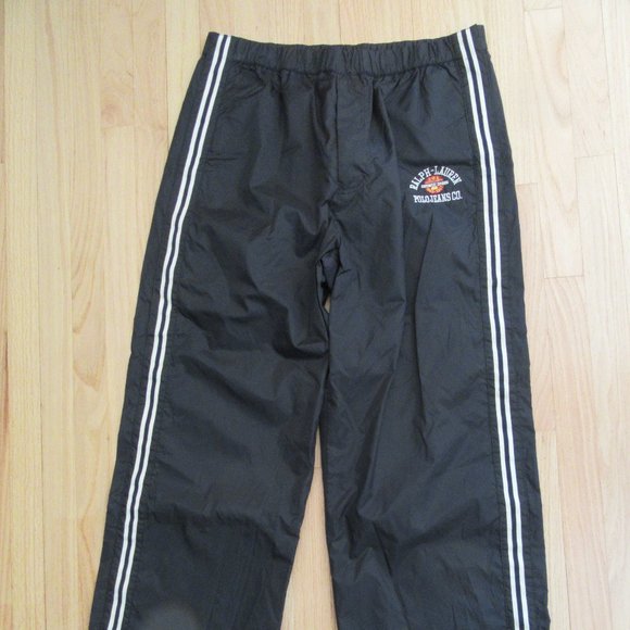 We have a rare pair of vintage Ralph Lauren track pants!Black.White stripes.Snaps down the sides.YKK zipper.Pockets on the back side.Elastic waist.Size extra large and measures 17" across front of waist, 13" from wait to crotch, 30" inseam and leg opening is 10" across.There are no rips, holes, tears or stains.Super nice, rare, vintage pair of Ralph Lauren track pants!We have a smoke free home.Please read the description and view the pictures before purchasing.Thanks so much for stopping by!!**19H**