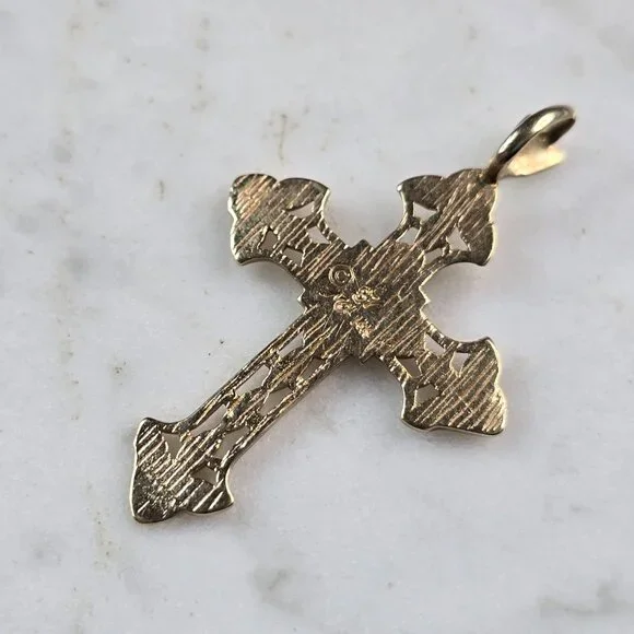 A WOMENS VINTAGE ESTATE 14K YELLOW GOLD RELIGIOUS MICHAEL ANTHONY CROSS PENDANT.THE PENDANT WEIGHS 1.8g AND MEASURES 1 3/8" LONG BY 7/8" WIDE.PENDANT IS MARKED.MAKES A GREAT GIFT...