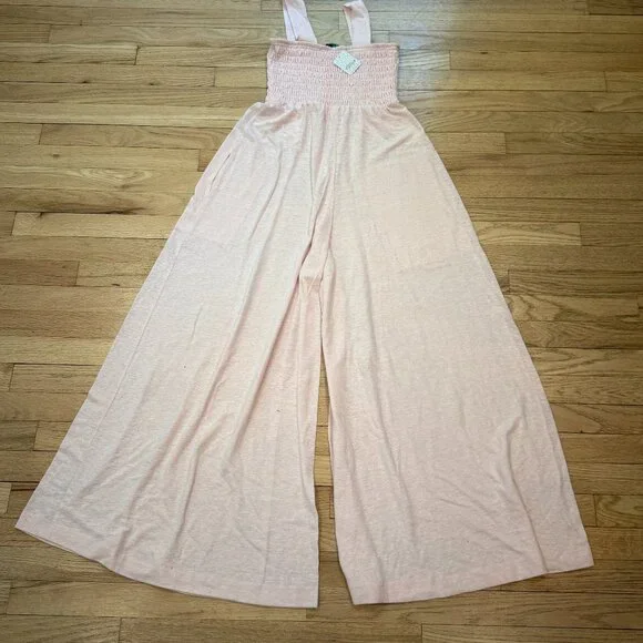Free People Homecoming Jumper NWT Size XSIn a comfortable linen-blend fabrication, this easy jumpsuit features a stretchy smocked design at the bust and an ultra wide leg...