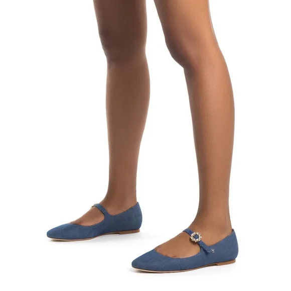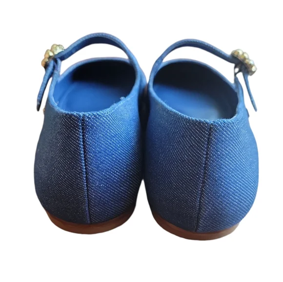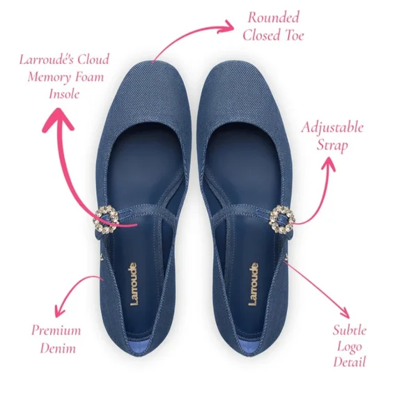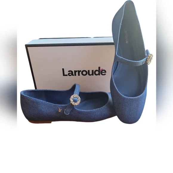 NWT Larroude Blair Ballet Flatinsole made with memory foam cushion, closed round toe, logo gold hardware, adjustable ankle strap with jeweled buckle,box included color: blue denim size: 8material: cotton denim, leather soleflats, comfort, chic, staple wardrobe,fall, trendy, trends, mary jane