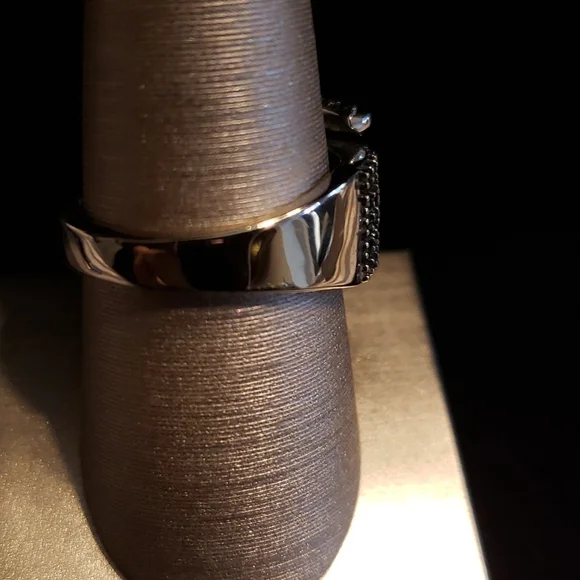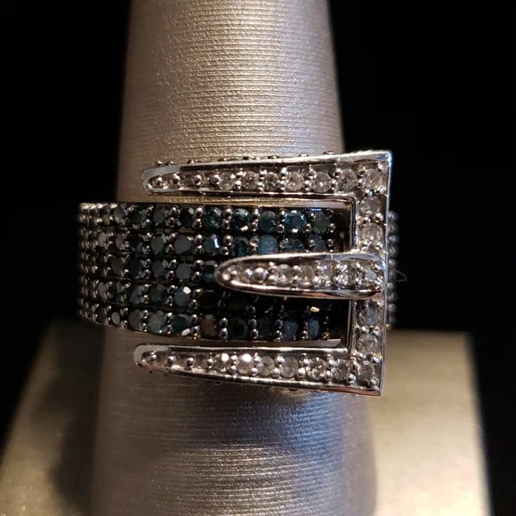 Unique ladies 10 Karat White Gold diamond ring. Blue and White treated diamonds. 5 grams