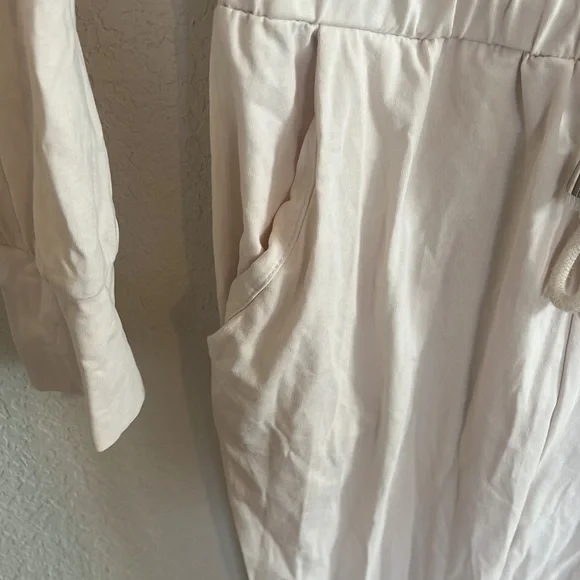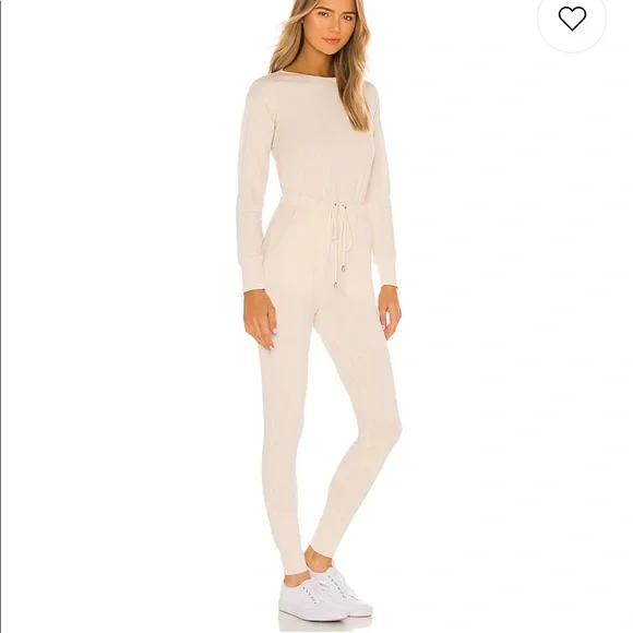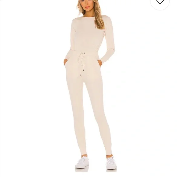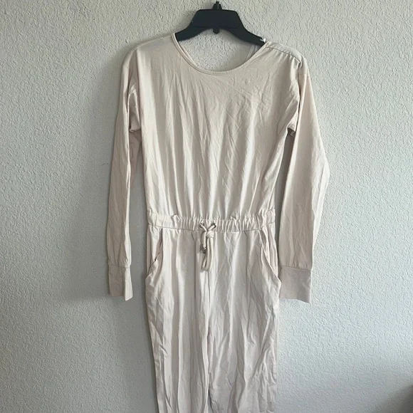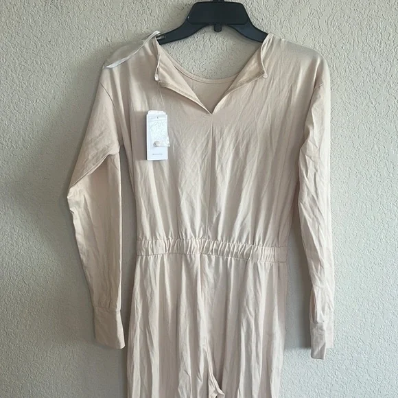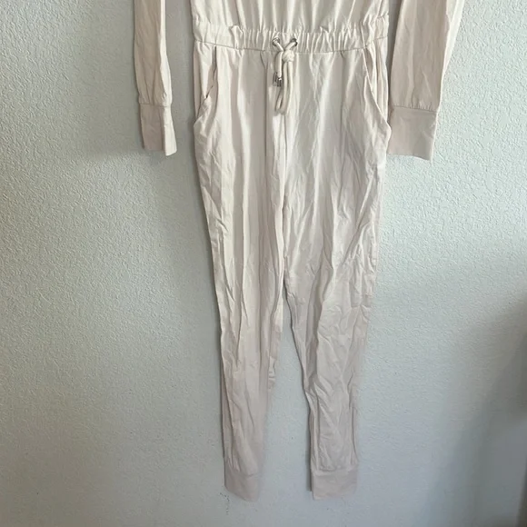 Pit to pit 19.5”Length 56”Waist 13.5”Size small Nwt Vela Lounge Jumpsuit in Nude95% cotton, 5% spandexHand wash coldElastic waistband with drawstring closureBack keyhole with loop button closure and side seam pocketsRuns small, consider sizing up