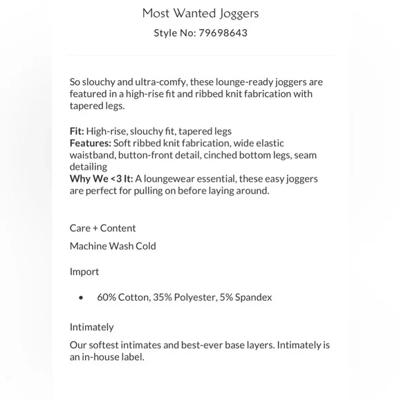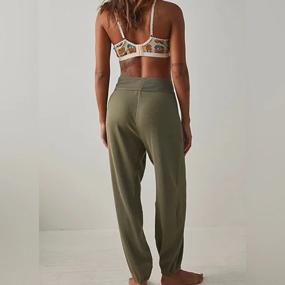 Brand new without tagsNWOTFree People Intimately Most Wanted Joggers Color: GreenSize: SmallProduct DetailsSo slouchy and ultra-comfy, these lounge-ready joggers are featured in a high-rise fit and ribbed knit fabrication with tapered legs. High-rise, slouchy fit, tapered legs. Soft ribbed knit fabrication, wide elastic waistband, button-front detail, cinched bottom legs, seam detailing. A loungewear essential, these easy joggers are perfect for pulling on before laying around.Intimately - the brand’s softest intimates and best-ever base layers. Intimately is an in-house label.60% Cotton, 35% Polyester, 5% SpandexStyle No. 79698643