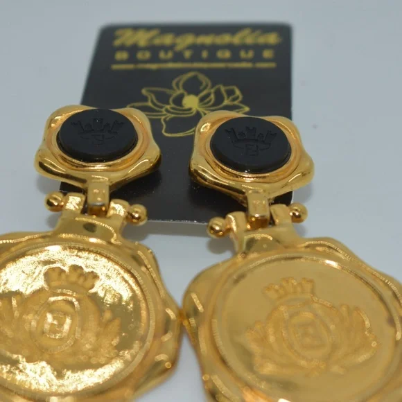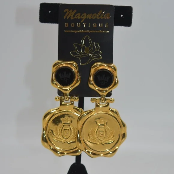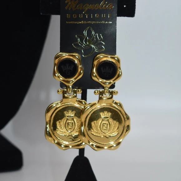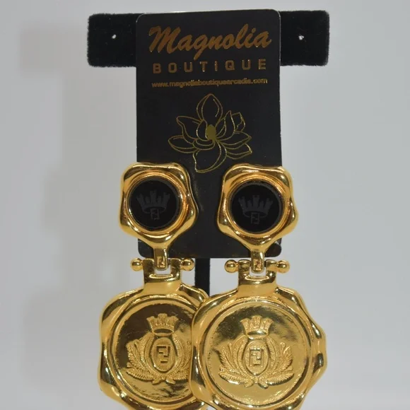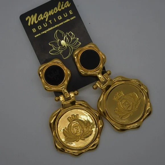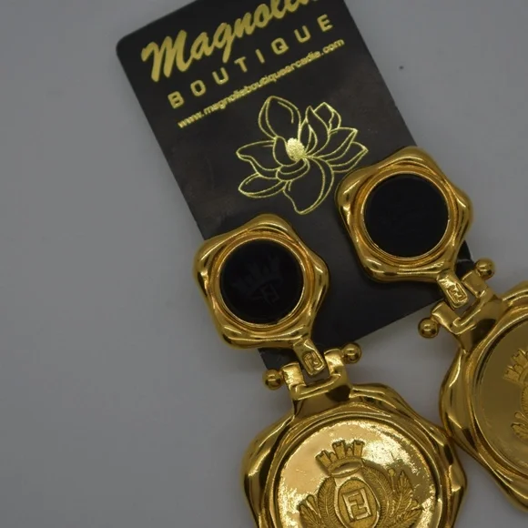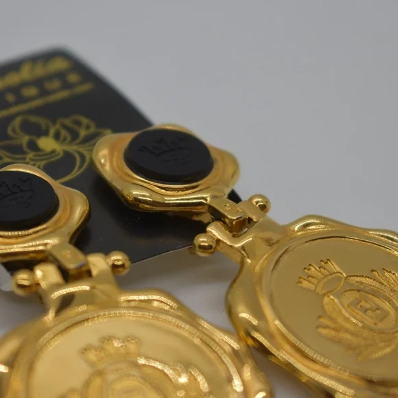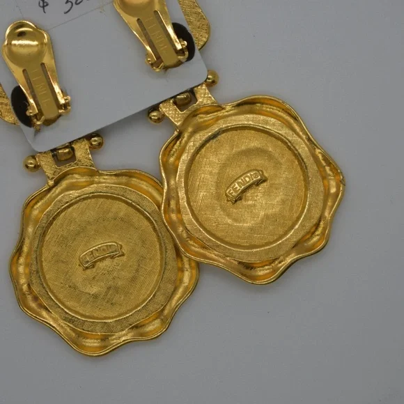 Fendi Crown Wax Stamp Drop Earrings Materials: Gold plated, Brass, GlassClip-on Closure Measurements: Length 2.4", Width 1.5"Metal finish: High Polish, Florentine Great Condition...