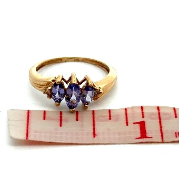 * Estate 10k Yellow Gold Timeless 3 Stone Tanzanite Diamond Accents Size 3.75 Ring* Ring size: 3.75* Top of ring measures: 1/4" x 7/16"* Height: 3/16"* Band width: 1 mm* 1 main tanzanite measures approximately 4.8 mm x 3 mm.* 2 smaller tanzanites measure approximately 3.6 mm x 2.4 mm each.* 2 round diamonds measure approximately 0.8 mm each.* Weight: 1.1 tgw* Ring can be resized.* Unmarked.* Professionally assayed.* Condition: As pictured.* G5182