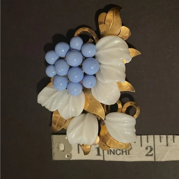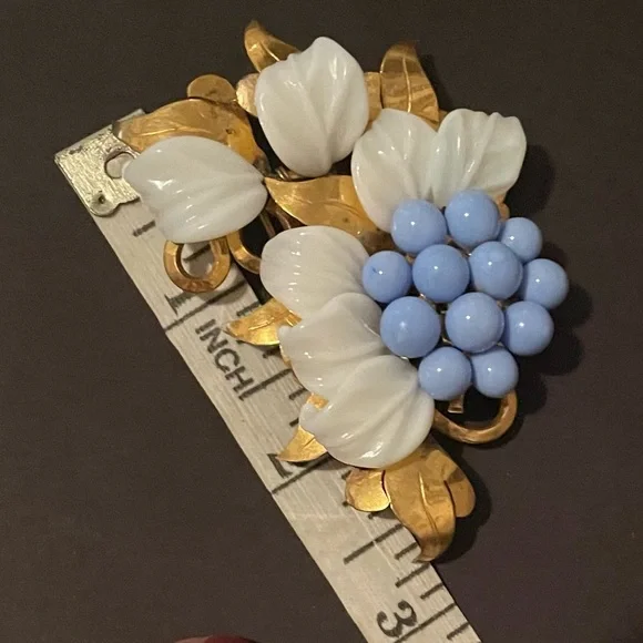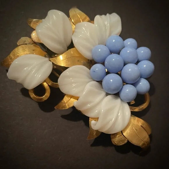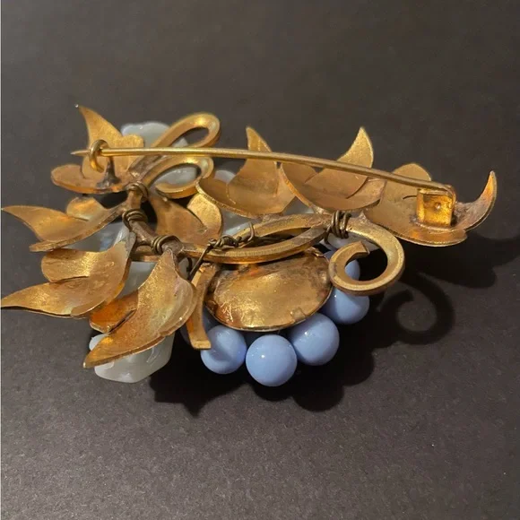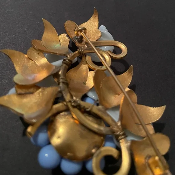 A stunning and rare piece. Hand crafted. Possible French. And with the C clasp could possibly be 19th Century. Fe a tures- Gold tone hand cut metal leaves and vines- Lamp-work glass leaves and berries- Size: 2.75 x 1.75 inches