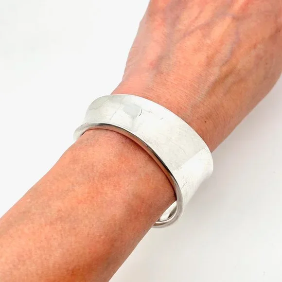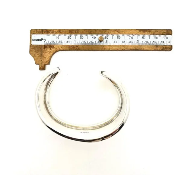 This is a highly collectible, truly iconic RLM piece from the late 70´s-early 80´s.Hand forged in the USA of 47 grams of Sterling Silver.There is no wrong way to wear it. Light expected signs of wear /age throughout, nothing significant.It looks much much better on and layers well.Please examine photos closely as they are part of the description.All things considered, it is in very good vintage condition.As pictured, it is a tad too big for my 6" wrist.It would fit a 6.5" to 7.25" wrists perfectly.