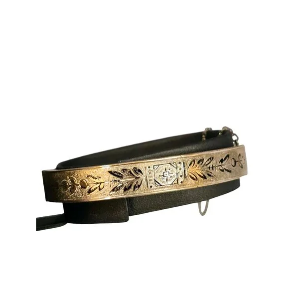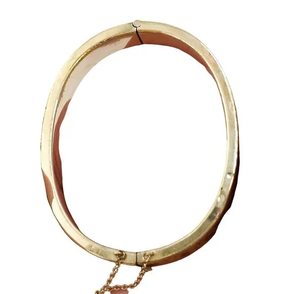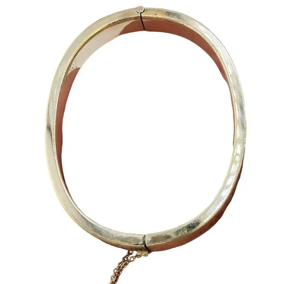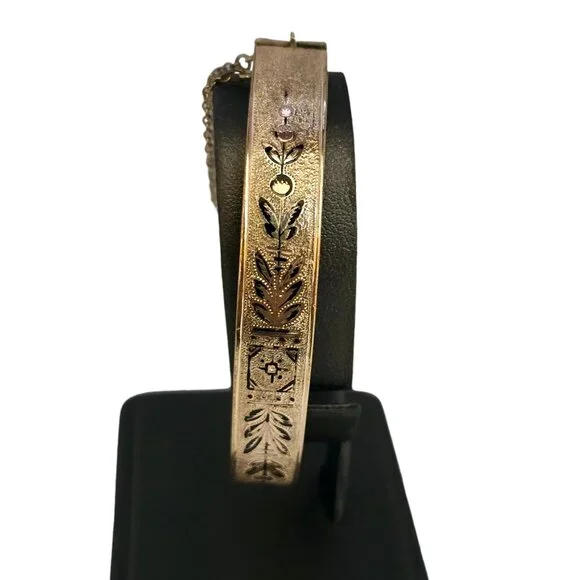 Antique Gold Filled All Over Embossed Design Bangle Bracelet (A6840)Size: 2.25" InnerdiameterColor: GoldCondition: Very good condition Signed: NoneDetails: Front has a square front otherwise the design is the same all over design.Safety chain.Condition: Pre-OwnedPlease look at all the photos, as they are part of the description. I try my best to point out any flaws.Also please remember this is a preloved piece and may show signs of light wear, marks, scratches, etc.I will be posting a lot more jewelry, Keep checking back.