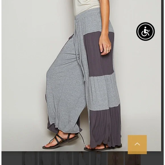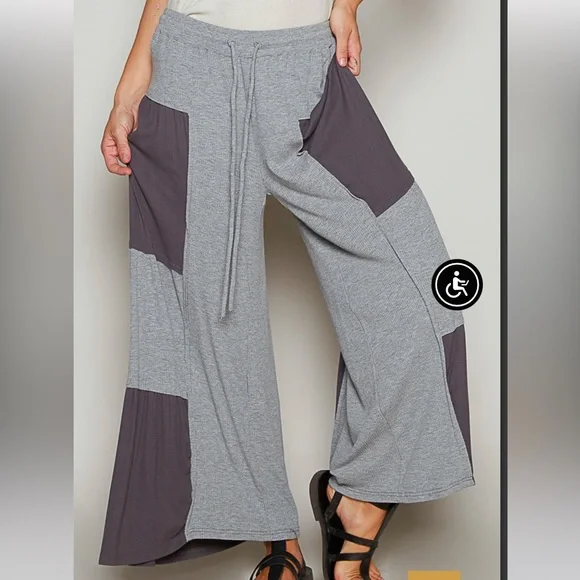Super comfortable!Elastic waistband with drawstring.No pockets.Wide legs.Layered light gray with dark gray, light gray ribbed fabric with dark gray smaller ribbed fabric.94% rayon...