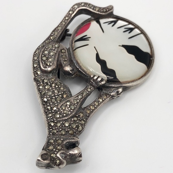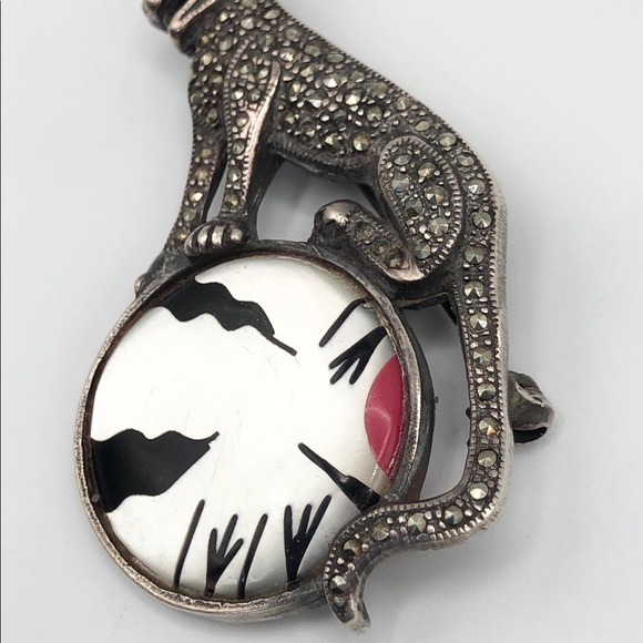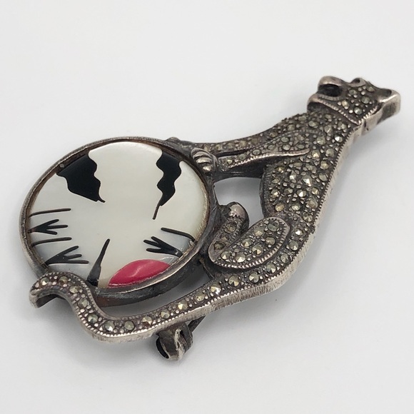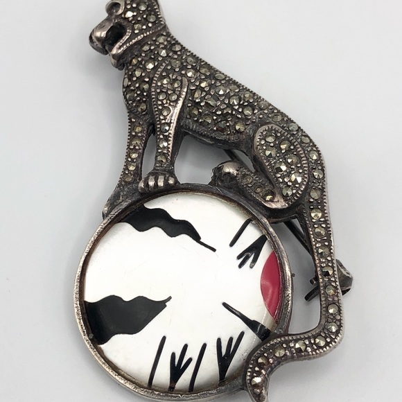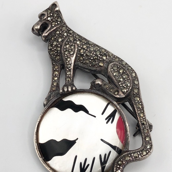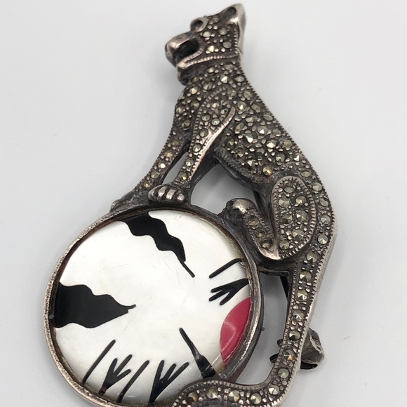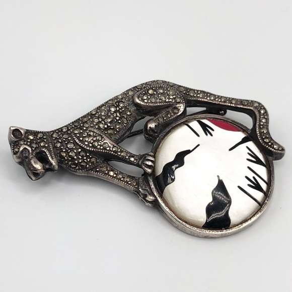 Antique Art Deco Sterling Jaguar Panther Big Cat MOP Marcasite Stones Brooch Pin. Marcasite stones. Sterling silver big cat jungle cat. Mother of Pearl with enamel. Extremely well...