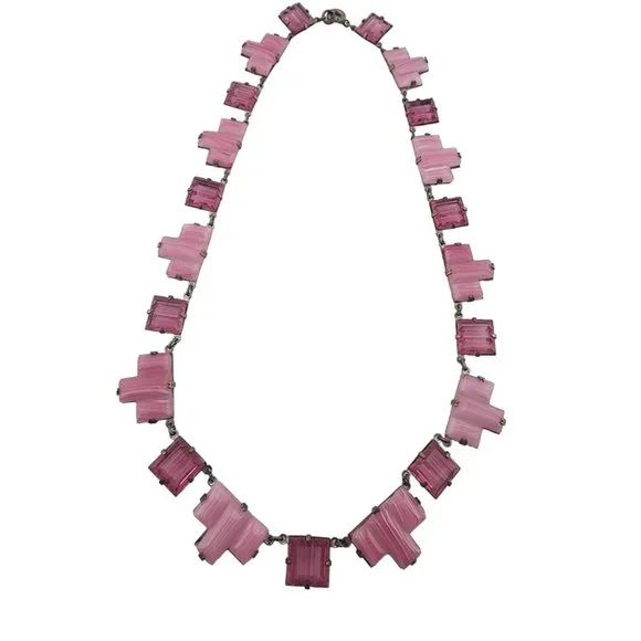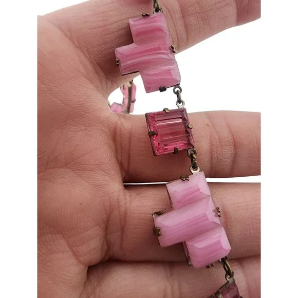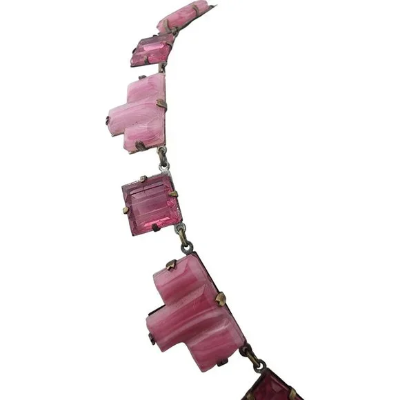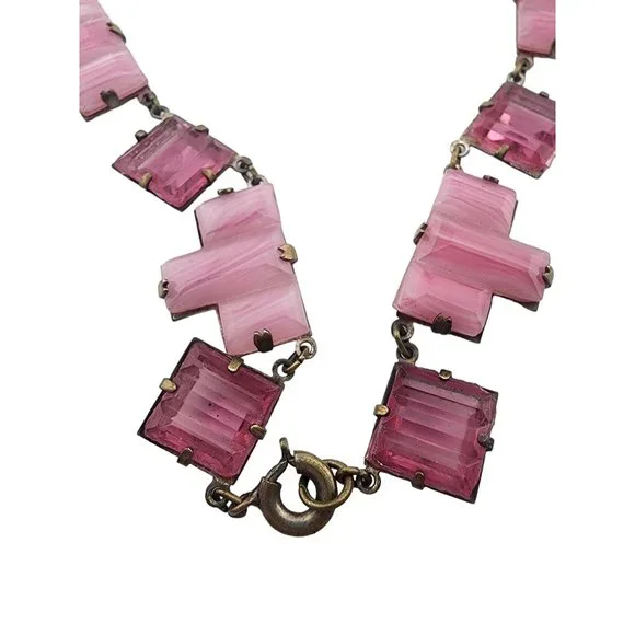 Antique Super Rare Opaque Striated & Clear Art Deco Vauxhall Necklace (A3270)Size: 16.5"Color: PinkCondition: Very good conditionEra: Circa 1920sSigned: NoneDetails: Absolutely amazing pink glass set in brass metal. Very unique to see in opaque.Please look at all the photos, as they are part of the description. I try my best to point out any flaws.Also please remember this is a preloved piece and may show signs of light wear, marks, scratches, etc.I will be posting a lot more jewelry, Keep checking back.