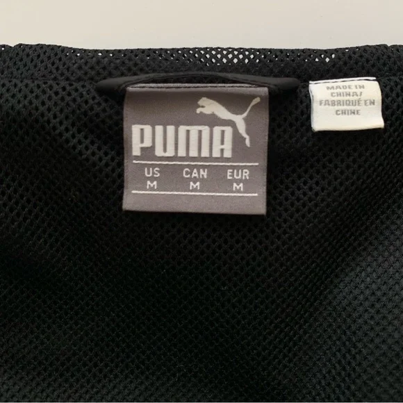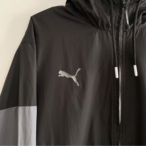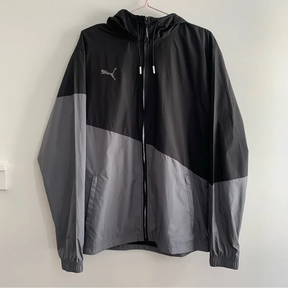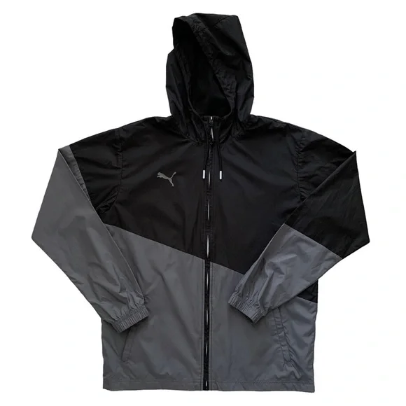 Puma Black & Grey Unisex Hooded Zip Up Windbreaker JacketPuma cat logo on right chestZippered hand pocketsFull zipperHoodedMesh-linedSize: M (unisex sizing)Condition: Excellent preowned condition. Worn only once. No flaws.Materials: 100% polyester, mesh liningApproximate Measurements (Taken with garment laying flat):- Length: 28"- Pit to pit: 22.5"- Sleeve length (neck to end of sleeve): 31.5" ☆ Open to offers!☆ Ships next day!☆ Color may appear slightly different from photos. ☆ From smoke-free & pet-free home.Feel free to reach out with any questions! xx