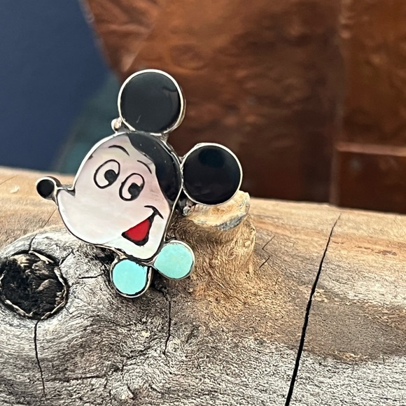 This is a vintage Native American sterling silver Zuni inlay Mickey Mouse ring. This ring features turquoise, coral, onyx, and mother of pearl stones. The ring is signed Zuni with...