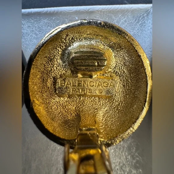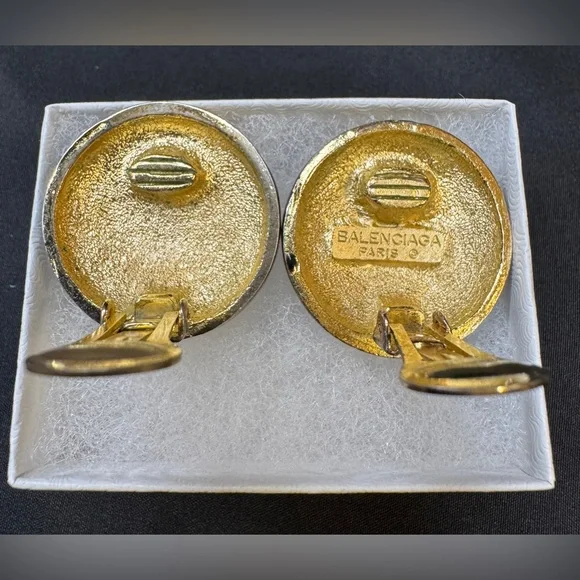 Preloved Balenciaga Authentic Rare Round Black and Gold Clip on Earrings - Signed and Stamped Serial # Beautiful and Elegant - Perfect for all occasionsApproximate Size: 3/16” eachThey are in good Preloved condition. There is normal signs of wear. Beautiful and unique.See pictures for measurements and a detailed description. Sold As Is