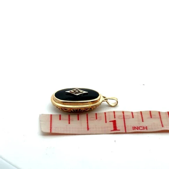 * Designer 14KT Yellow Gold Art Deco Oval Black Onyx Diamond Pendant * Length including bale: 15/16"* Inner bale measures: 4 mm x 2 mm * Width: 7/16"* Weight: 2.5 tgw* 1 Round...