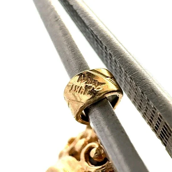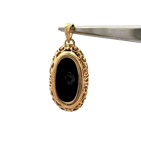 * Designer 14KT Yellow Gold Art Deco Oval Black Onyx Diamond Pendant * Length including bale: 15/16"* Inner bale measures: 4 mm x 2 mm * Width: 7/16"* Weight: 2.5 tgw* 1 Round Diamond measures approximately 1.5 mm * 1 Oval Black Onyx measures approximately 15.5 mm x 7.1 mm * Chain is sold separately. * Marked: Makers Mark * 14KT * Condition: As pictured. * G5141