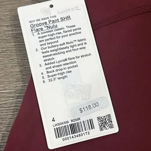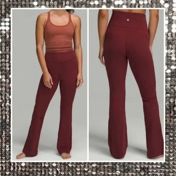 Lululemon Groove Super-High-Rise Flared Pant *NuluRed Merlot A coveted classic returns. These flared pants are perfect for your practice (and your post-practice look).nulu™Lightweight, buttery-soft Nulu™ fabric wicks sweat and is four-way stretchbuttery-soft handfeellightweightsweat-wickingfour-way stretchfeaturesDesigned for: On the MoveLycra®: Added Lycra® fibre for shape retentionStorage: Waistband pocket holds your phoneSuper high rise: Super high rise keeps you feeling coveredInseam: 32.5" inseam