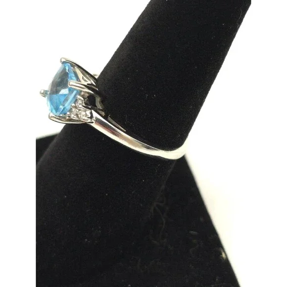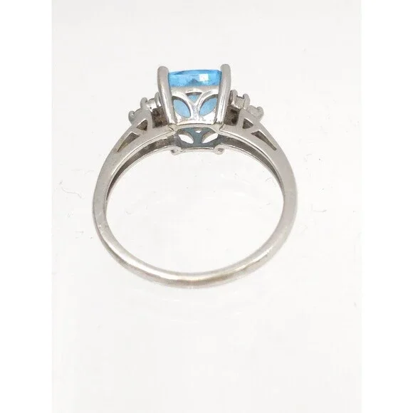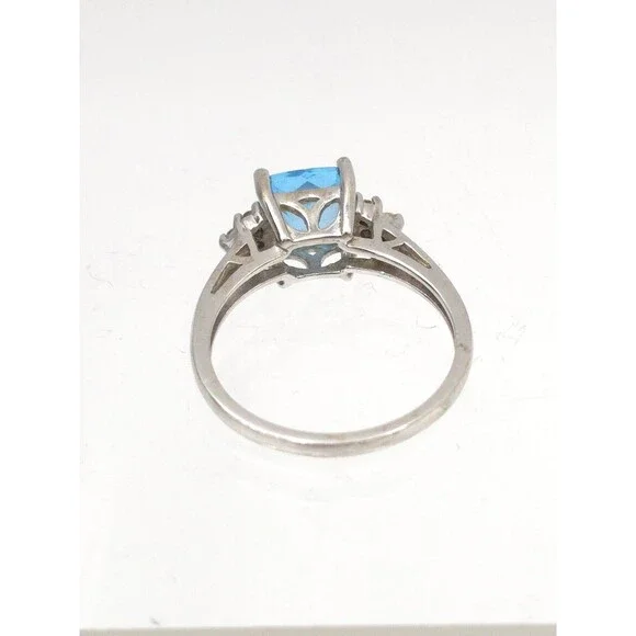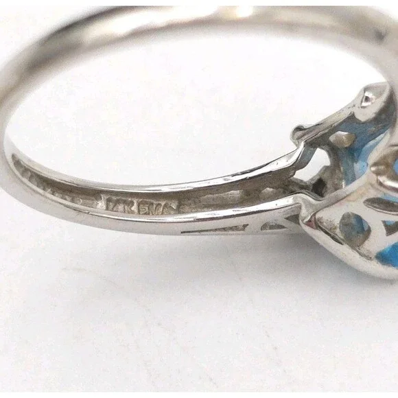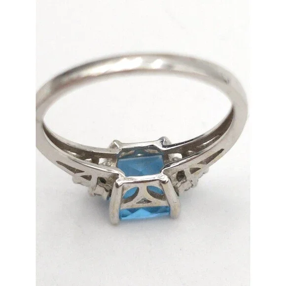 14k White Gold Ring With Princess Cut Blue Topaz & 6 Diamonds Signed EMA Size 7