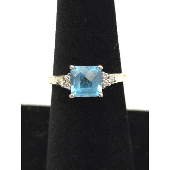 14k white gold ring with princess cut blue topaz and 6 diamonds. Marked EMA. Ring is about a size 7. Topaz measures approximately 7 mm each side. Very good pre-owned condition...