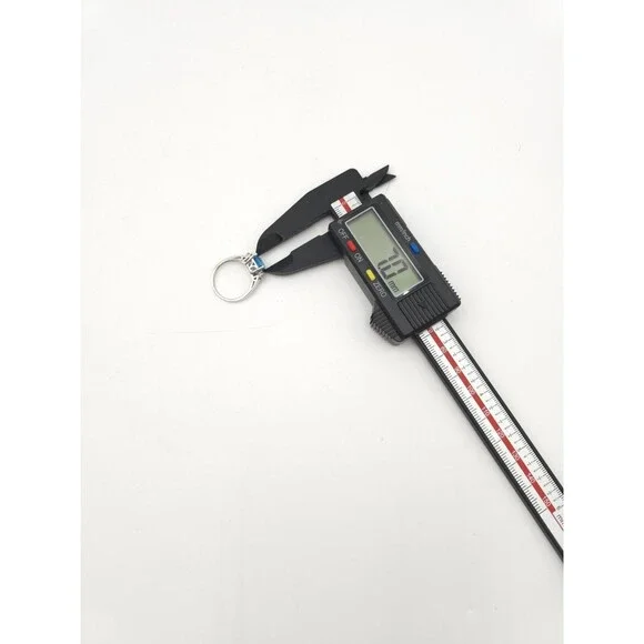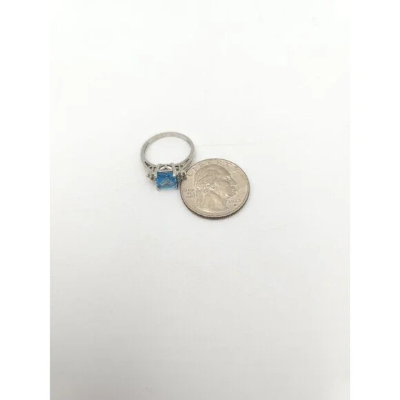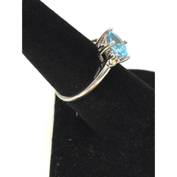 14k white gold ring with princess cut blue topaz and 6 diamonds. Marked EMA. Ring is about a size 7. Topaz measures approximately 7 mm each side. Very good pre-owned condition with minor wear, including light scratches and scuffs on band. Please see pictures.