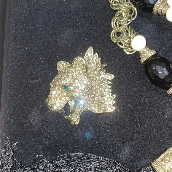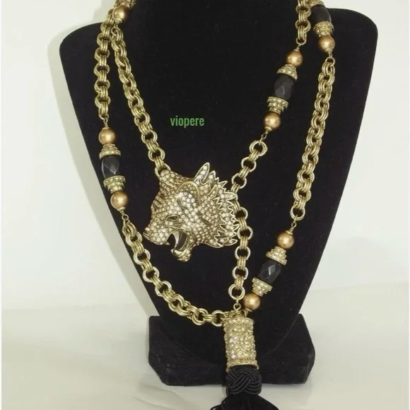 Make a bold statement with this stunning gold and black wolf pendant necklace. Perfect for adding a touch of elegance and fierceness to any outfit. Measurements :41" L x 1/2" W x1/2" HDropMeasurements : 6-112" L x 3/4" W x3/4" H Materials : Faceted jet color beads, black tassel, emerald and crystal golden honey color crystals.Original package.