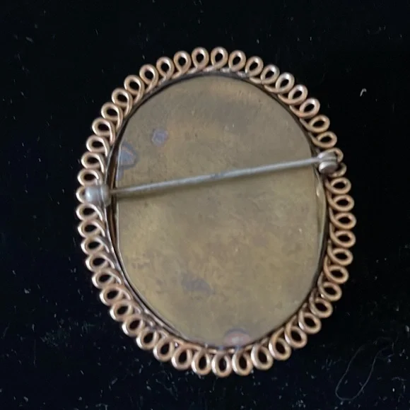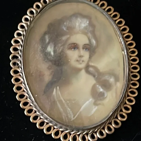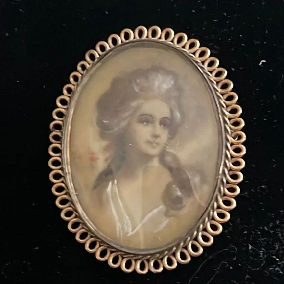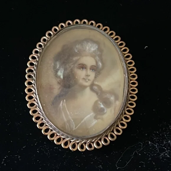 She has striking blue eyes and is a beautiful woman of middle age at least I think the scroll work around the glass is gold or at the very least gold filled but more likely it’s gold I can’t find any stamp on it I have taken it apart but nothing She’s special