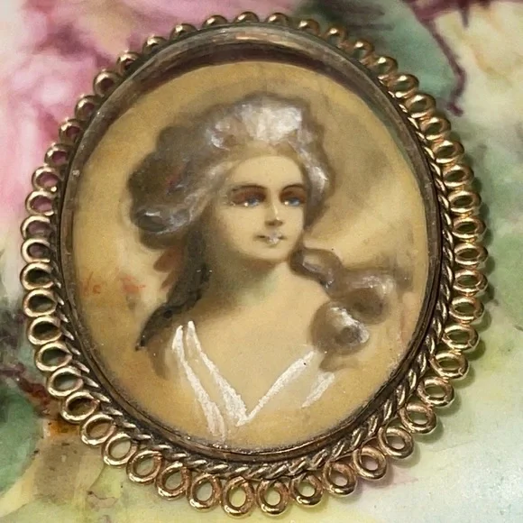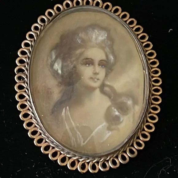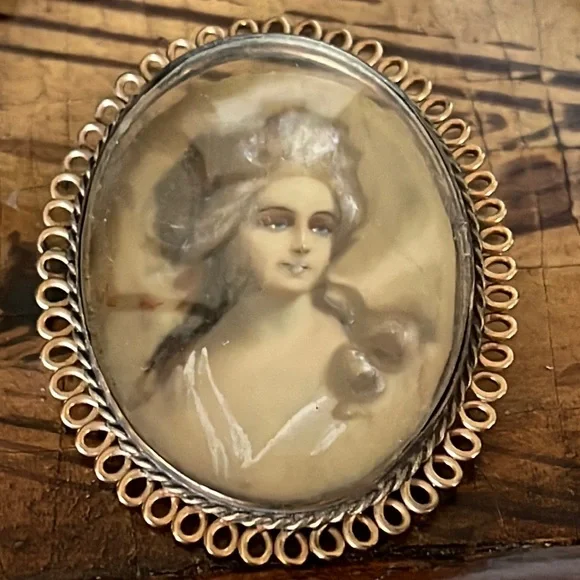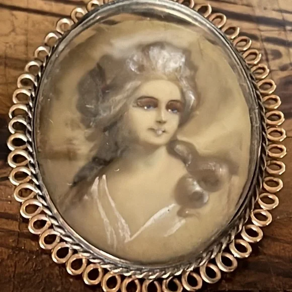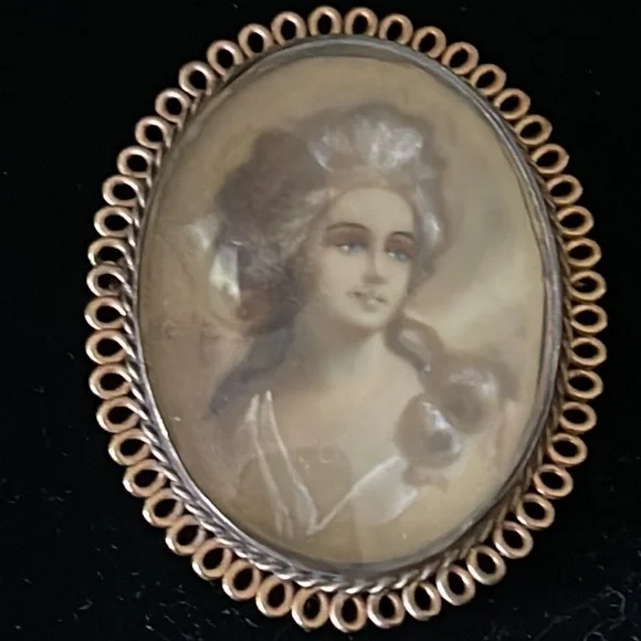 She has striking blue eyes and is a beautiful woman of middle age at least I think the scroll work around the glass is gold or at the very least gold filled but more likely it’s...