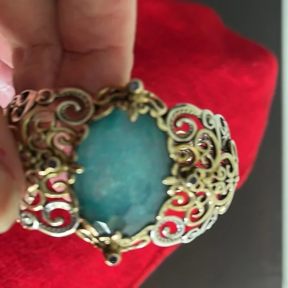 Carolyn pollack brilliance quartzite doublet /brass bracelet. Intricate and luxurious with graceful scrollwork. This wide sterling silver and brass cuff bracelet is gorgeous! Blue quartzite doublet that is accented by 4 round iolite gemstones. No hinge or clasp. 1 1/2 in wide. Can be manipulated a little to fit on and fits average wrist.