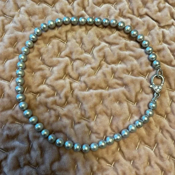 Gorgeous grey cultured freshwater pearls -approximately 7.5 mm with a generous sterling silver clasp with diamonique simulated diamonds.16 in in length; 1/4 in width.