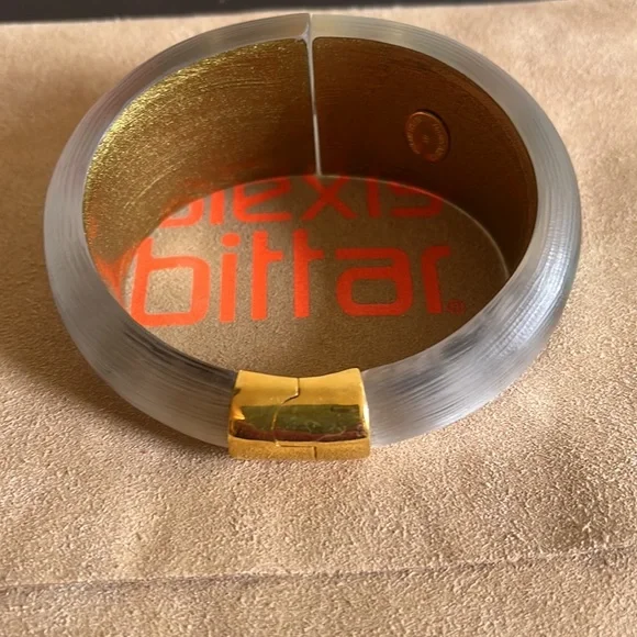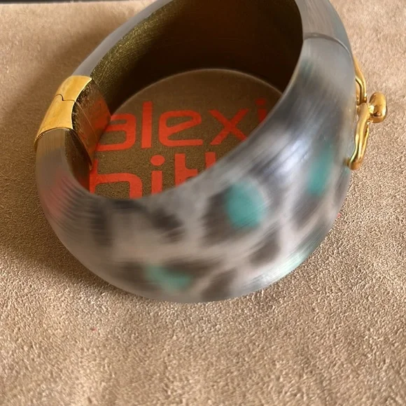 Beautiful hinged cuff by Alexis Bittar! Gold accents with a safari print of taupe and green Fits average size wrist. Just stunning!!