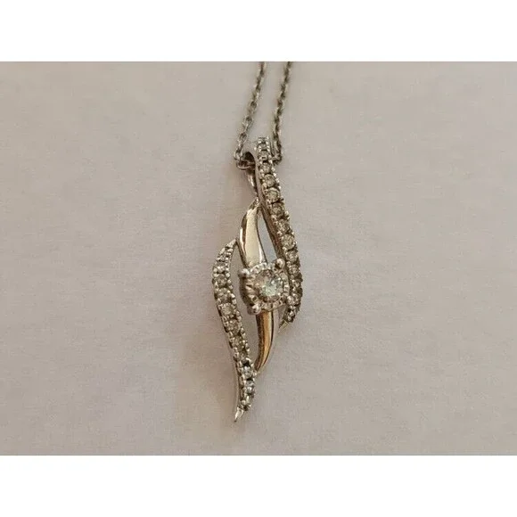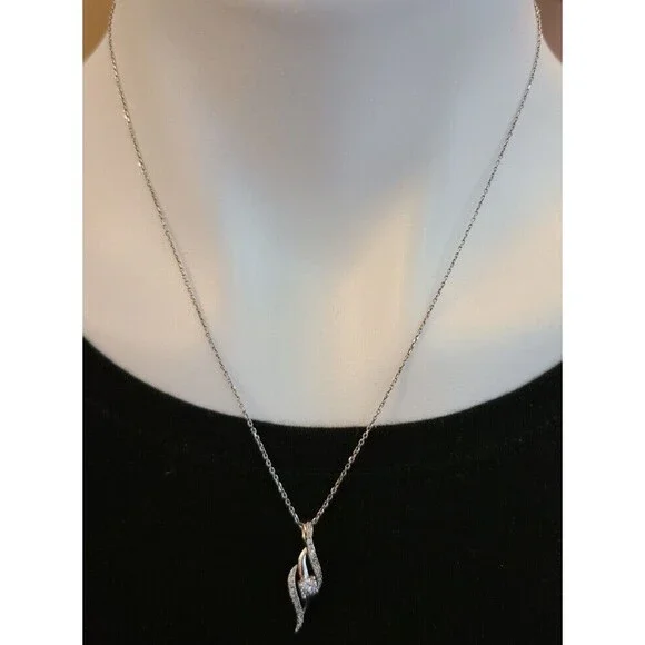 Styled in the prettiest sterling silver, this 18-inch cable chain necklace features a lovely twisting pendant that is elegantly graced with ribbons of shimmering round diamonds....