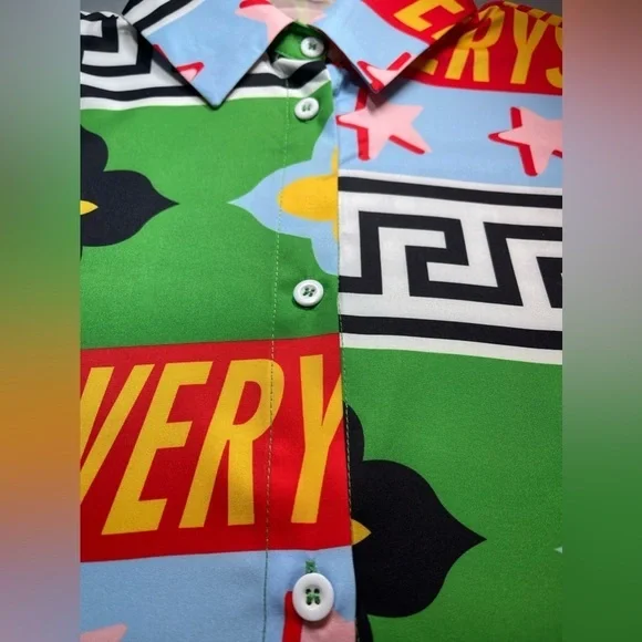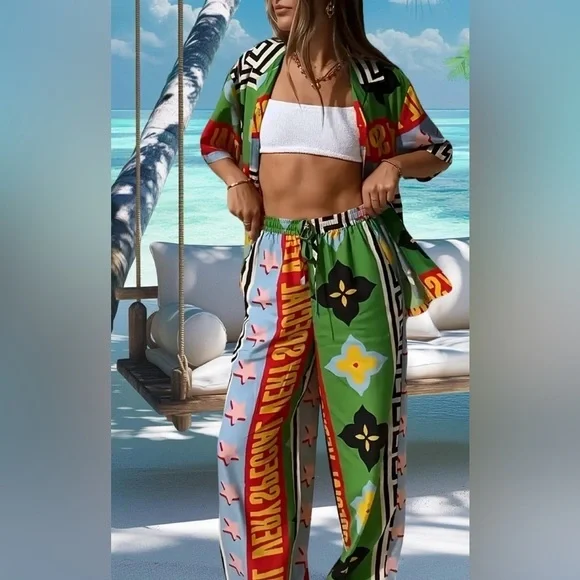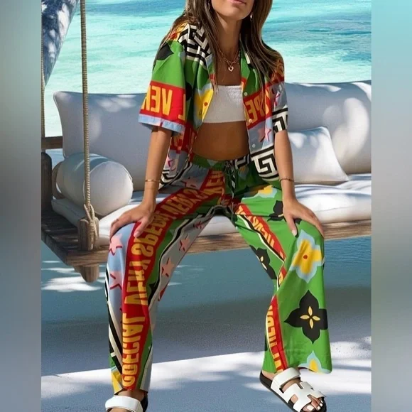 Multicolor Two Piece-SetVacation Random PrintLoose FitShort SleevesCollar ShirtButton-DownNo Shoulder PadsElastic WaistDrawstring Waist Relaxed FitSide PocketsLong Pants95% Polyester 5% SpandexCoco Cache’ Boutique ItemItem#B16-240420-06Ships in 24 hoursNumeric size tags are only for exposure since most stores, brands or garments do not share the same sizing measurements.Please read measurements prior to making a purchase. Flat by hand, please allow .5”-1” difference.Small 2/4Waist 24"-26"Rise 13"Inseam 29"Length 41"Bust 38"Length 27"Medium /6 (Sold Out)Large 8/10 (Sold Out)X-Large 12/14Waist 30"-34"Rise 13"Inseam 29"Length 43"Bust 44"Length 28"Disclaimer: Pattern Placement on the fabric may vary per piece. Travel Vacation Summer Spring Tropical Vacay Pool Party Safari Camping Weekend Wear Resort Fashion What to Wear Trousers SlacksPantalones Shorts Pants Breeches Hottest Pants Low-Slung Baggy Pants Wide Leg Straight Leg Pants Boxer Style Work Fashion Ribbed Knit Cotton Linen Comfortable Flattering Roomy Thick Waistband High Waist Lounging Dress-up Funky Pants Bold Whimsical Psychedelic Versatile Lightweight Street Fashion Hot Pant Short Shorts Modest Weekend Wear Oversized.Classy Beachwear Tropical Prints Vacay Vibes Hawaiian Tunic Caribbean Trending Now What to Wear on Vacay Street Fashion Elegant Kaftans Beach Party Pool Party Lounging Weekend Wear Short Sleeves Las Vegas Modest Cocktails Bohemian Cover ups.