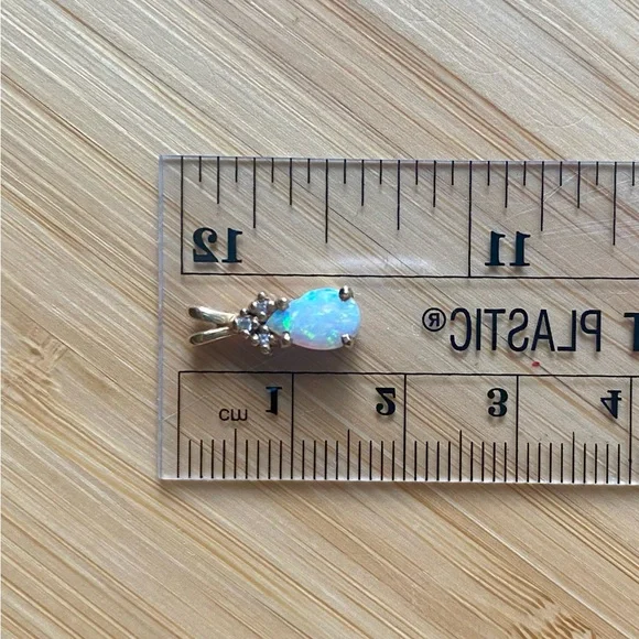 This stunning opal and diamond pendant features a captivating opal stone set in a gold setting. Perfect for adding a touch of elegance to any outfit. 10k gold.