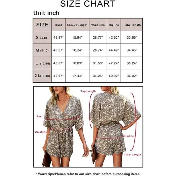 - Color: Khaki- 100% Polyester- Imported- Snap closure- Machine Wash- Design: 3/4 Short Sleeve Womens Romper/Leopard Print Womens Jumpsuit Shorts/Wrap Jumpsuit/V Neck/High...