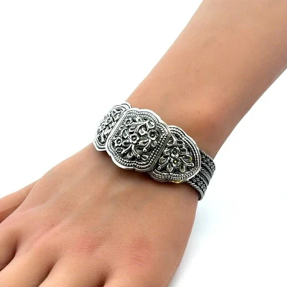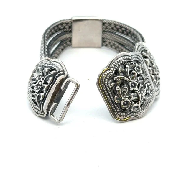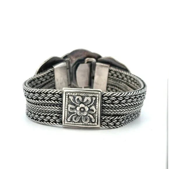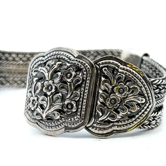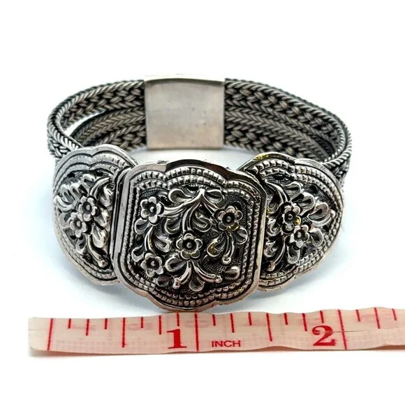 * Designer 925 Sterling Silver Multi Strand Floral Braided Link Statement Bracelet* Length: 6-3/4"* Width: 3/4"* Weight: 68.3 g* Marked: 925* Condition: As pictured.* S7616